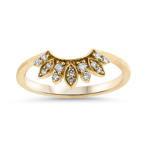 This 14K yellow gold diamond band showcases a distinctive fanned design accented with sparkling diamonds. Crafted for versatility, it can be elegantly stacked with other rings or worn alone as a refined statement piece.