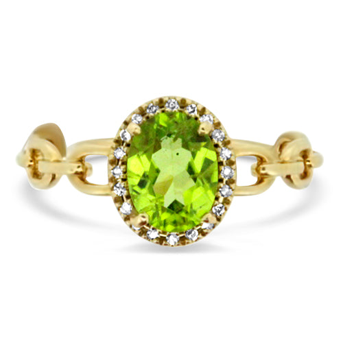 This stylish modern ring features a vibrant peridot center stone with a halo of sparkling diamonds.