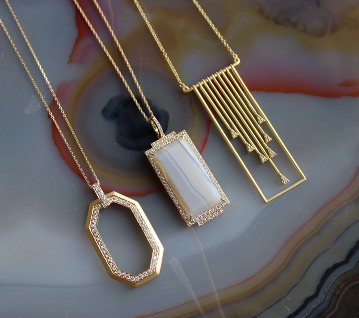 A beautiful matte yellow gold geometric necklace makes the perfect statement featuring bright white diamonds.